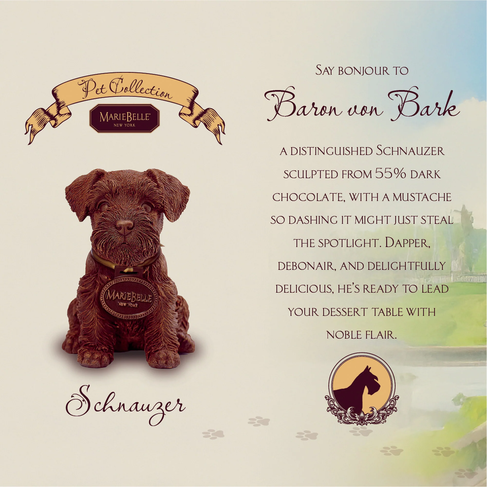 Prepare yourself for the whimsical world of MarieBelle’s Chocolate Pets Collection! Our latest enchanting creation, each of these exquisite chocolate sculptures seem to wag their tails right off the plate. Handcrafted by a master culinary artisan, each delightful pet is fashioned entirely from rich Dark Chocolate, transforming the essence of our best fur friend into a tantalizing edible masterpiece. Hollow within, yet overflowing with joy, each one of MarieBelle’s Chocolate Pets is bursting with personality in every delightful detail.